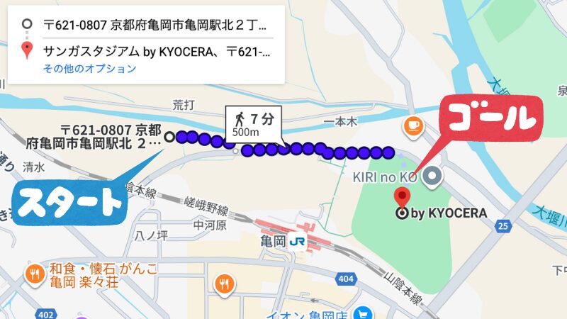 スタジアムへの来場は、亀岡駅から徒歩で移動、またはスタジアム付近の駐車場に停める方法があります。